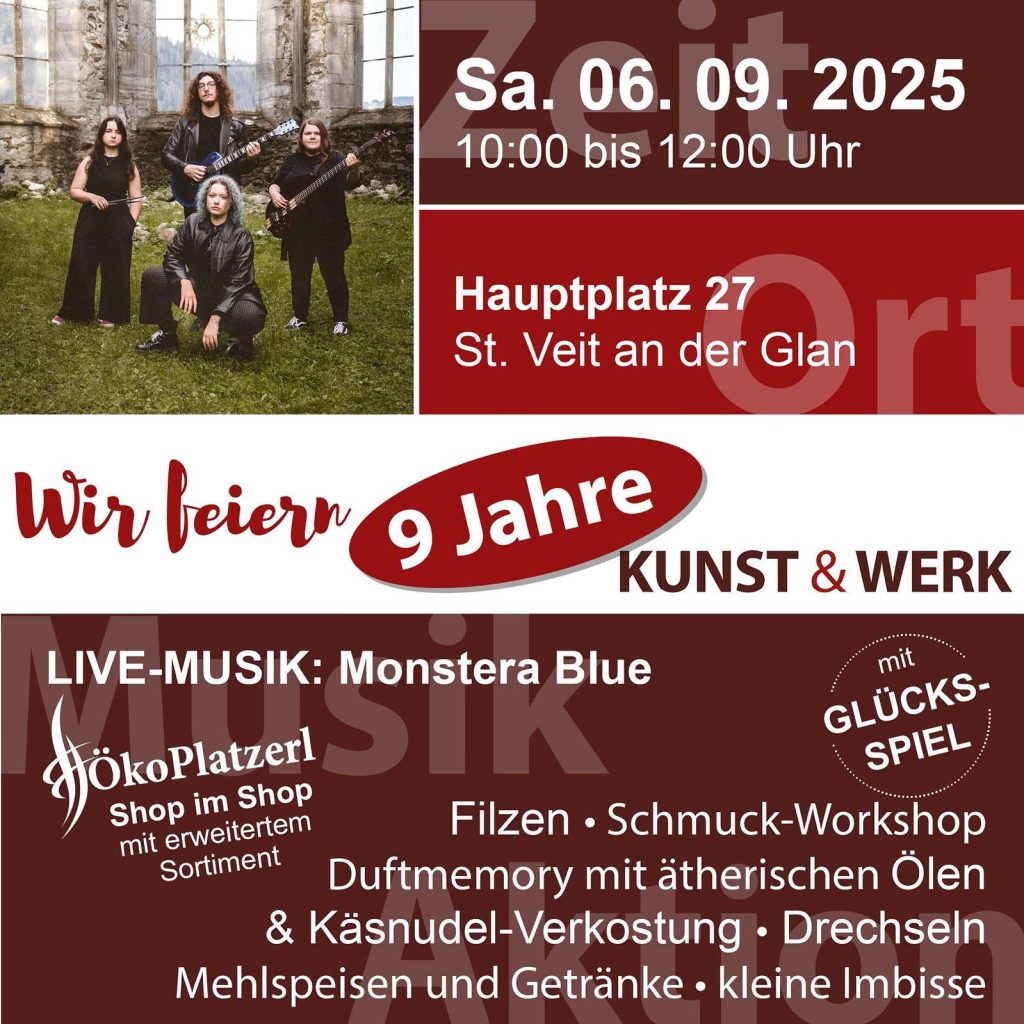 Wegen Schlechtwetter musste unsere 9-Jahresfeier leider verschoben werden. Doch wir holen das Fest natürlich nach und laden Sie herzlich ein, am Samstag, den 6. September 2025 mit uns zu feiern! Es erwartet Sie ein vielfältiges Programm mit Live-Musik, Glücks-Spiel, besonderen Produkten im Ökoplatzerl und natürlich viel handgemachter Kunst & Werk. Merken Sie sich den neuen Termin vor – wir freuen uns auf Ihren Besuch! |
